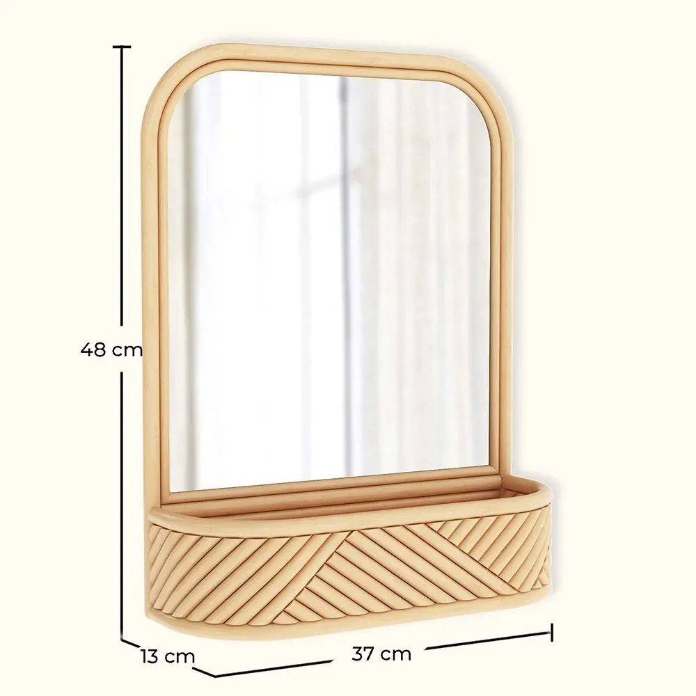 Nuestro espejo de pared de estilo boho quedará increíble en cualquier habitación de tu hogar. El diseño étnico del ratán lo hace perfecto para darle un toque natural al baño, la entrada o el dormitorio. El compartimento del espejo es perfecto para guardar objetos pequeños o para decorarlo con una pequeña planta. Mide 48 cm de alto y el compartimento tiene una anchura de 13 cm. Nuestro espejo de pared Dania está hecho de ratán natural y viene en un hermoso color natural.