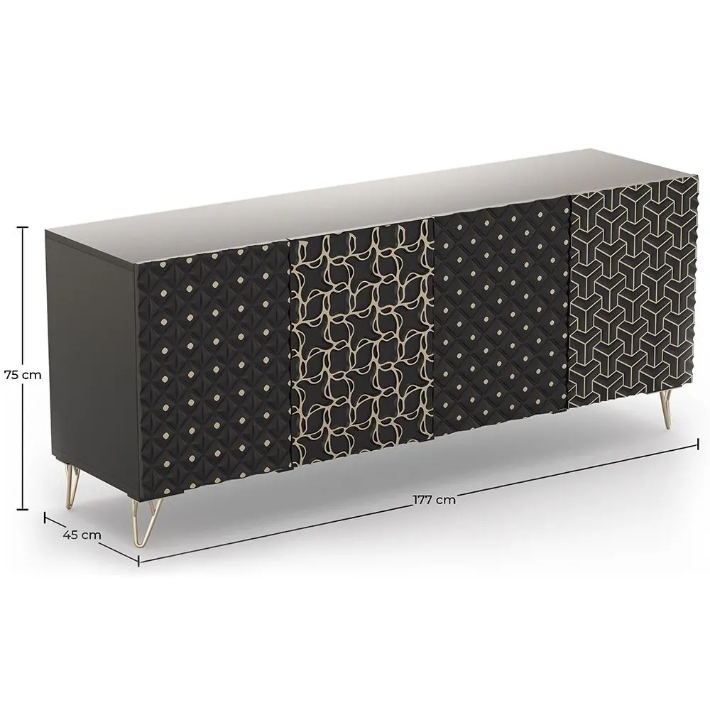 Ideal para darle a tu hogar un aspecto lujoso y moderno, nuestro aparador Prana no sólo es un mueble decorativo, también es tu aliado para almacenar gran cantidad de objetos. Este aparador de diseño está fabricado en madera de mando y sus patas de metal en color dorado,le confieren un toque elegante y clásico. Este aparador en color negro es perfecto para combinarlo con cualquier estilo de decoración.