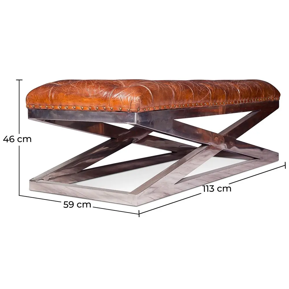 Este Banco acolchado y de cuero marrón de la gama Churchill Lounge, es sinónimo de elegancia y se insertará perfectamente en cualquier espacio, gracias sobre todo a los botones y a su cuidado acabado. Se puede adaptar a los entornos modernos y a los más tradicionales por igual. Su base se apoya en un marco de acero inoxidable amplio y resistente, y la base está hecha del mismo material. Este Banco Vintage está diseñada en piel y relleno de espuma para ofrecerle un confort ideal. El cuero está también cubierto por pequeños tornillos que le dan tanto un recurso práctico como estético. La combinación de estos dos materiales le aporta una estética única, una combinación de encanto y robustez.