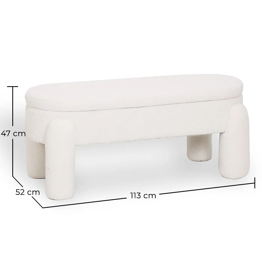 Este banco tapizado en tela bouclé blanco roto combina diseño moderno y funcionalidad práctica. Su asiento con apertura superior ofrece un amplio espacio de almacenamiento interno, ideal para guardar mantas, cojines, ropa u objetos del día a día.