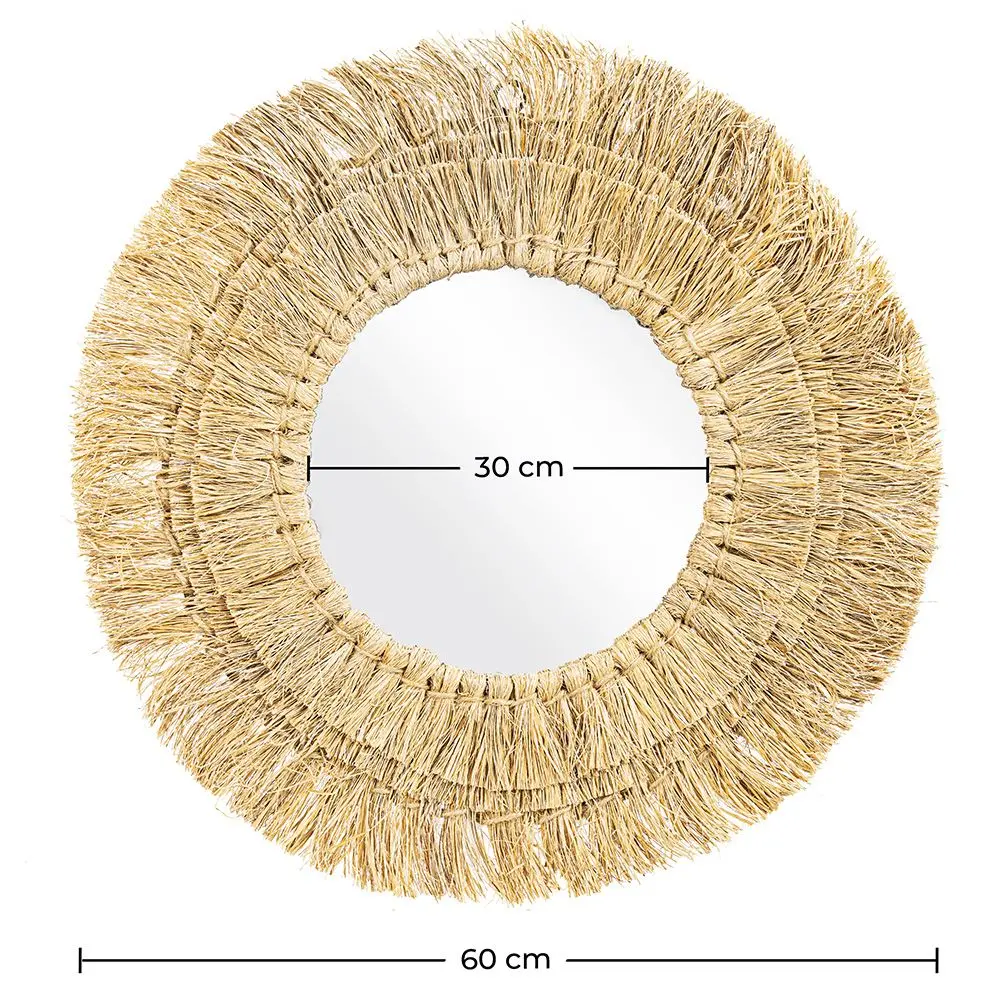 Nuestro espejo natural Qui está fabricado a mano en esparto, tiene un diámetro de 56 cm por lo que es ideal para colocar en espacios grandes, el dormitorio, la entrada de la casa, el baño. Este espejo de pared inspirado en el estilo boho puede aportar un aire natural y relajado a cualquier estancia. No pierdas la oportunidad y aprovecha nuestros grandes descuentos.