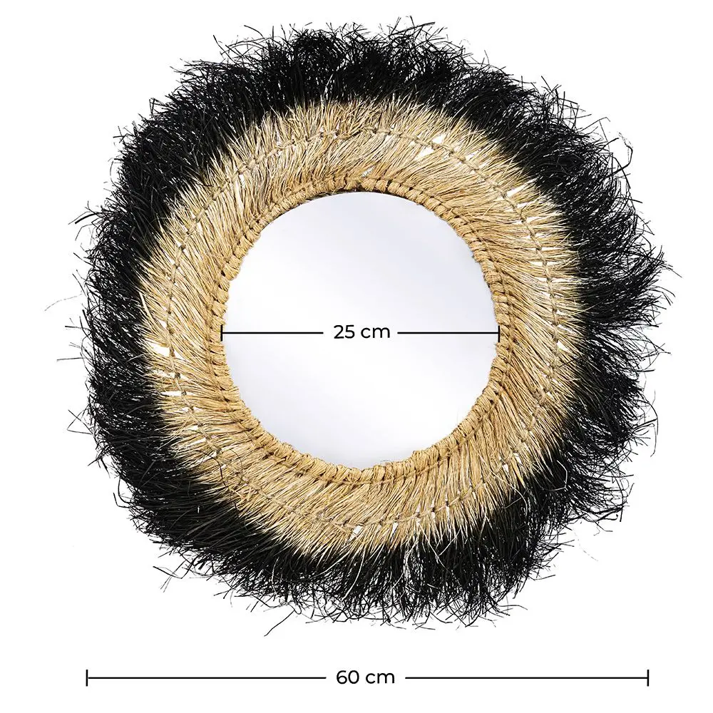 Déjate seducir por el estilo boho con nuestro espejo de pared redondo Melu. Este espejo de diseño está hecho a mano con esparto y conjuga de forma elegante el color natural con el negro, lo que lo hace perfecto para combinar con cualquier estilo de decoración. Es ideal para estancias amplias, ya que tiene un diámetro de 60cm.