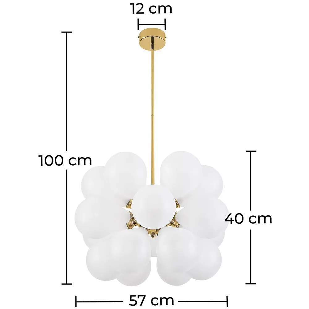 Si buscas una lámpara de techo que marque la diferencia, esta preciosa lámpara con 18 bombillas Led es ideal para ti. Fabricada en metal y con pantallas en forma de globo de cristal, esta lámpara destaca por su aspecto lujoso y sofisticado.