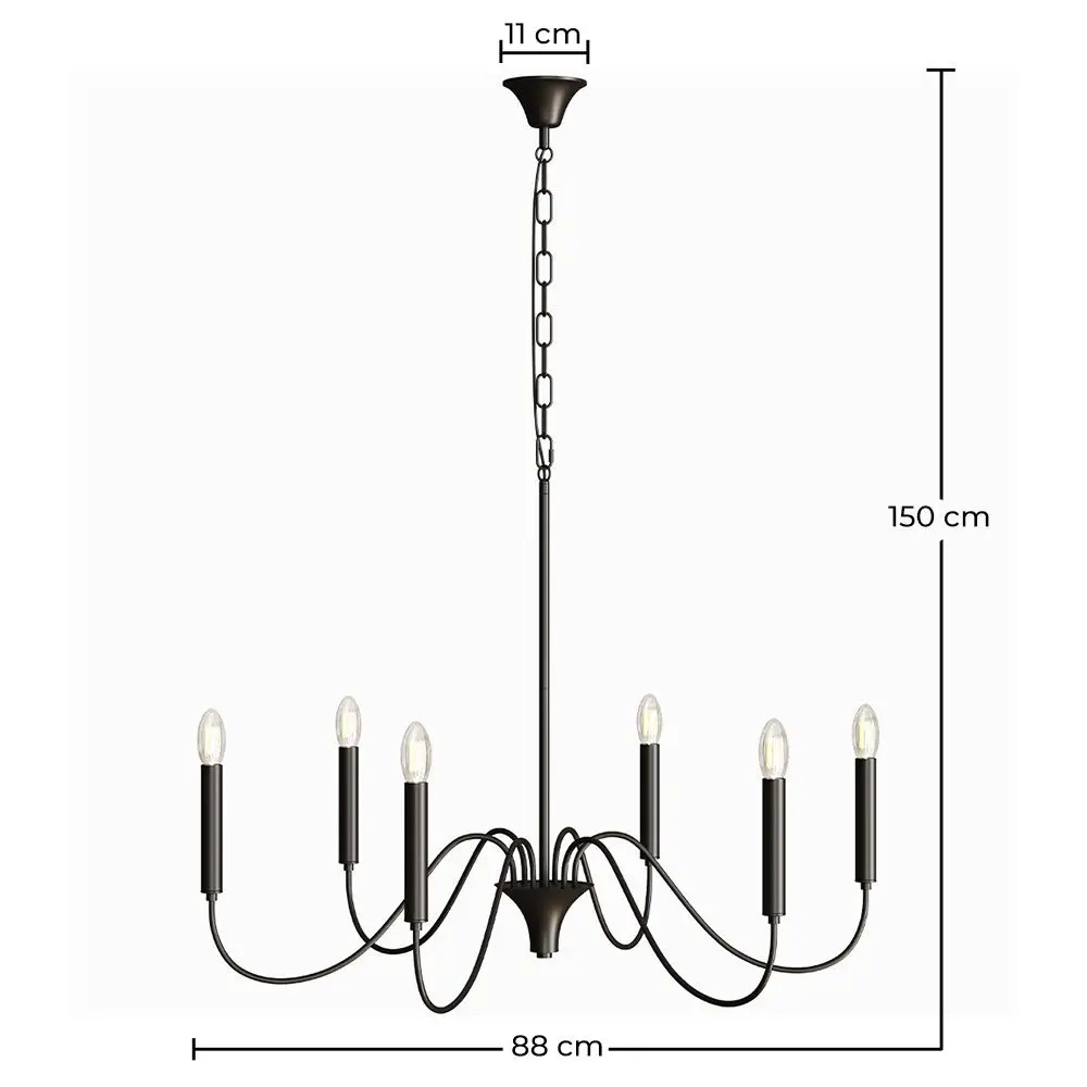 Aporta un toque elegante y contemporáneo a cualquier espacio con esta lámpara colgante de metal en color negro mate, inspirada en el diseño clásico de candelabros. Con seis brazos curvados, esta luminaria combina la estética tradicional con un aire moderno y minimalista, ideal para comedores, salones, entradas o espacios con techos altos.