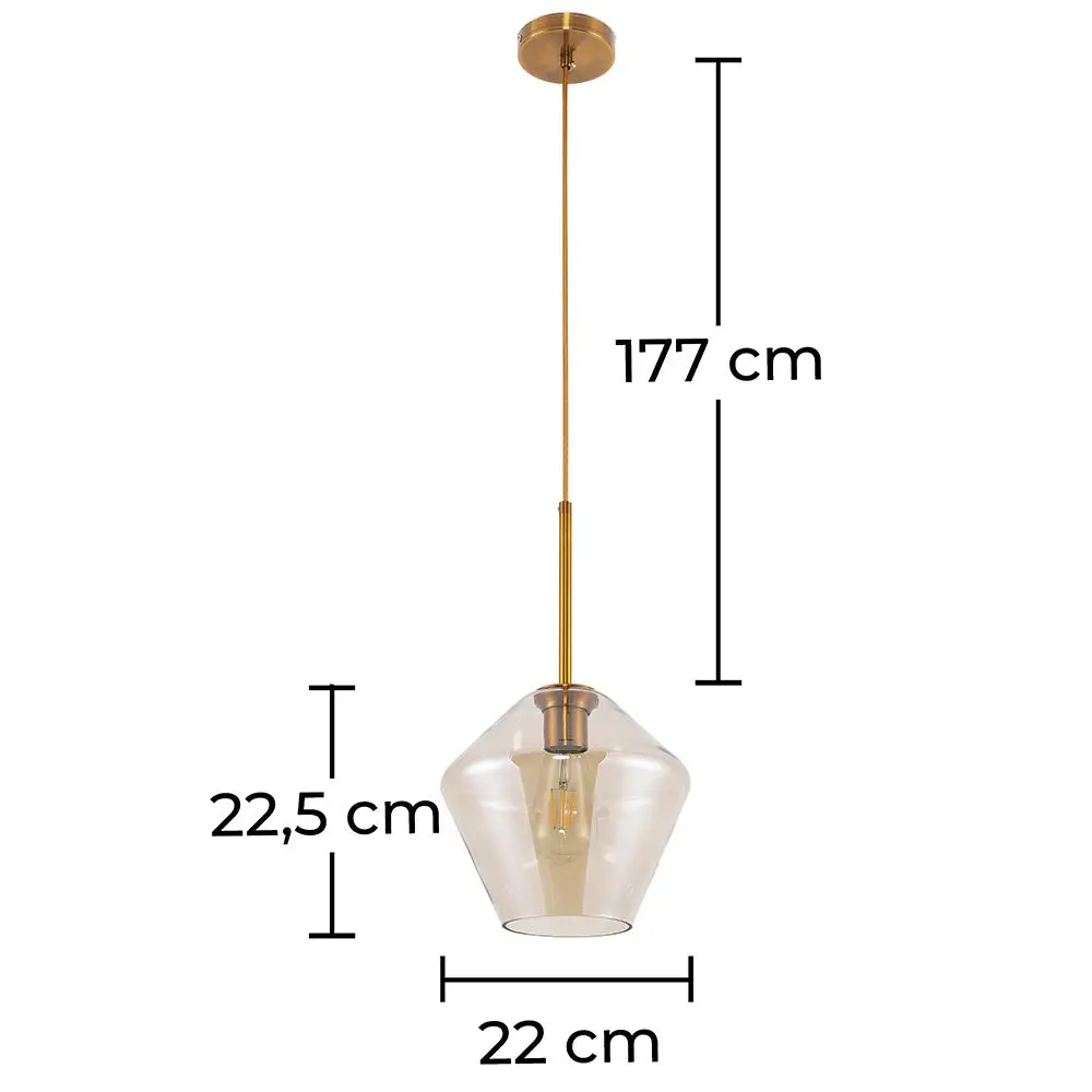 La pantalla de vidrio, disponible en múltiples variaciones de color, tiene un diámetro de 23 cm y una altura de 21,5 cm. La lámpara de diseño ajustable tiene un cable que se puede hacer más largo o más corto, dependiendo de la altura del techo. El portalámparas, la cubierta del techo y el gancho están hechos a mano con metal.