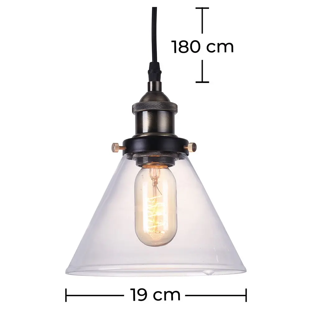 Esta lámpara colgante Edison con pantalla de cristal tiene un diámetro de 19cm y está fabricada de cristal y acero de carbono. Se trata de un modelo colgante que aportará glamour allí donde se coloque. Su pantalla de cristal hace de esta lámpara un complemento tan versátil que puede iluminar tanto una cocina, un comedor o un dormitorio.