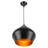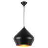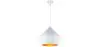 El exterior de latón batido crea una superficie negra que contrasta con el cálido color dorado del interior. Este creativo diseño proporciona una luz directa, y puede constituir un complemento artístico para cualquier estilo de decoración. Esta lámpara colgante está disponible también con el exterior blanco.