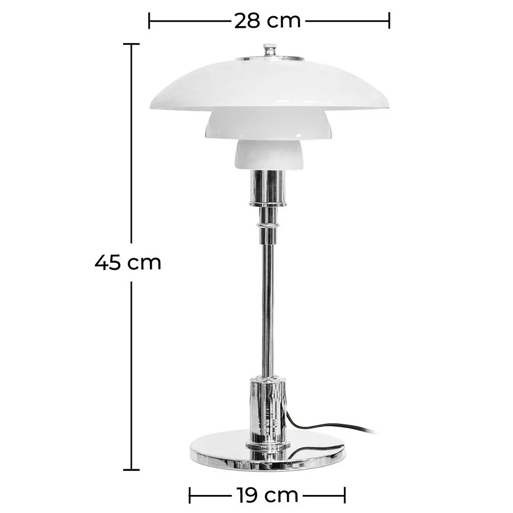 El diseño de esta moderna lámpara de escritorio PL 3/2 descansa sobre el principio de una pantalla reflectante, basada en una espiral logarítmica, en la cual el punto focal de la fuente de luz está localizado en el centro de la espiral. Las tres capas de vidrio opalino soplado, pulidas en el exterior y lijadas en el interior, emiten una luz suave y difusa.