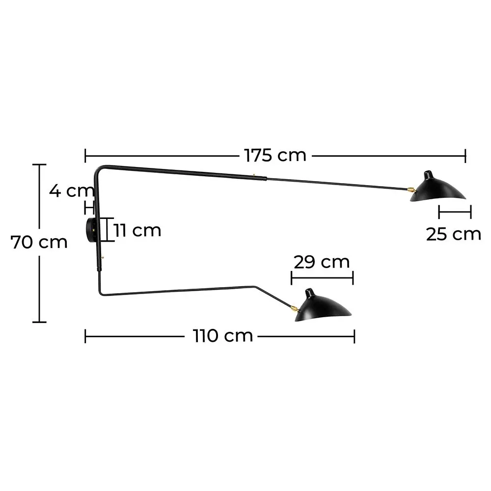 La lámpara de pared MRZ-R2C está formada por dos brazos con dos pantallas giratorias que permiten controlar la difusión de la luz hacia el punto deseado.