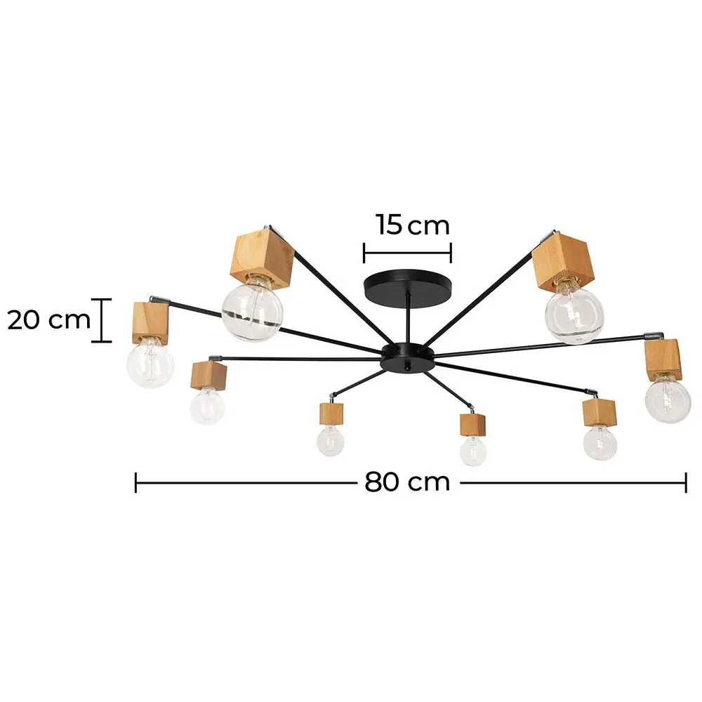 Esta original lámpara de techo de 8 bombillas está fabricada en metal y madera, su diseño innovador no pasará desapercibido ante nadie. Perfecta para colocar en una habitación de grandes dimensiones, con esta lámpara de techo no tendrás problema en iluminar bien cualquier espacio.