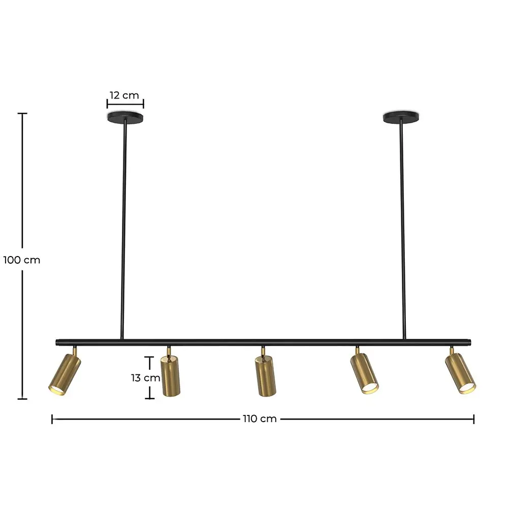 La lámpara de techo rail Lark con 5 focos dorados ajustables es una lámpara de diseño de calidad premium, ideal para usar en hoteles, restaurantes y cafeterías. Esta lámpara colgante de estilo moderno industrial tiene un largo de 110 centímetros y los focos regulables le permiten ajustar la posición de la luz para crear el ambiente perfecto en la sala.