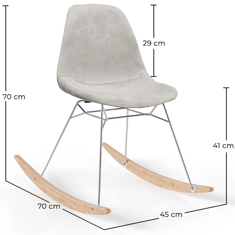 Disfruta de un momento de relax con esta elegante mecedora para adultos de diseño moderno. Su asiento ergonómico está tapizado en suave tela aterciopelada de alta calidad, ideal para aportar estilo y confort a cualquier estancia. La estructura combina patas de acero cromado con balancines curvos de madera maciza, proporcionando una base estable y un balanceo suave y agradable. Perfecta para el salón, el dormitorio o un rincón de lectura, esta mecedora es la fusión perfecta entre diseño contemporáneo, comodidad y materiales resistentes.