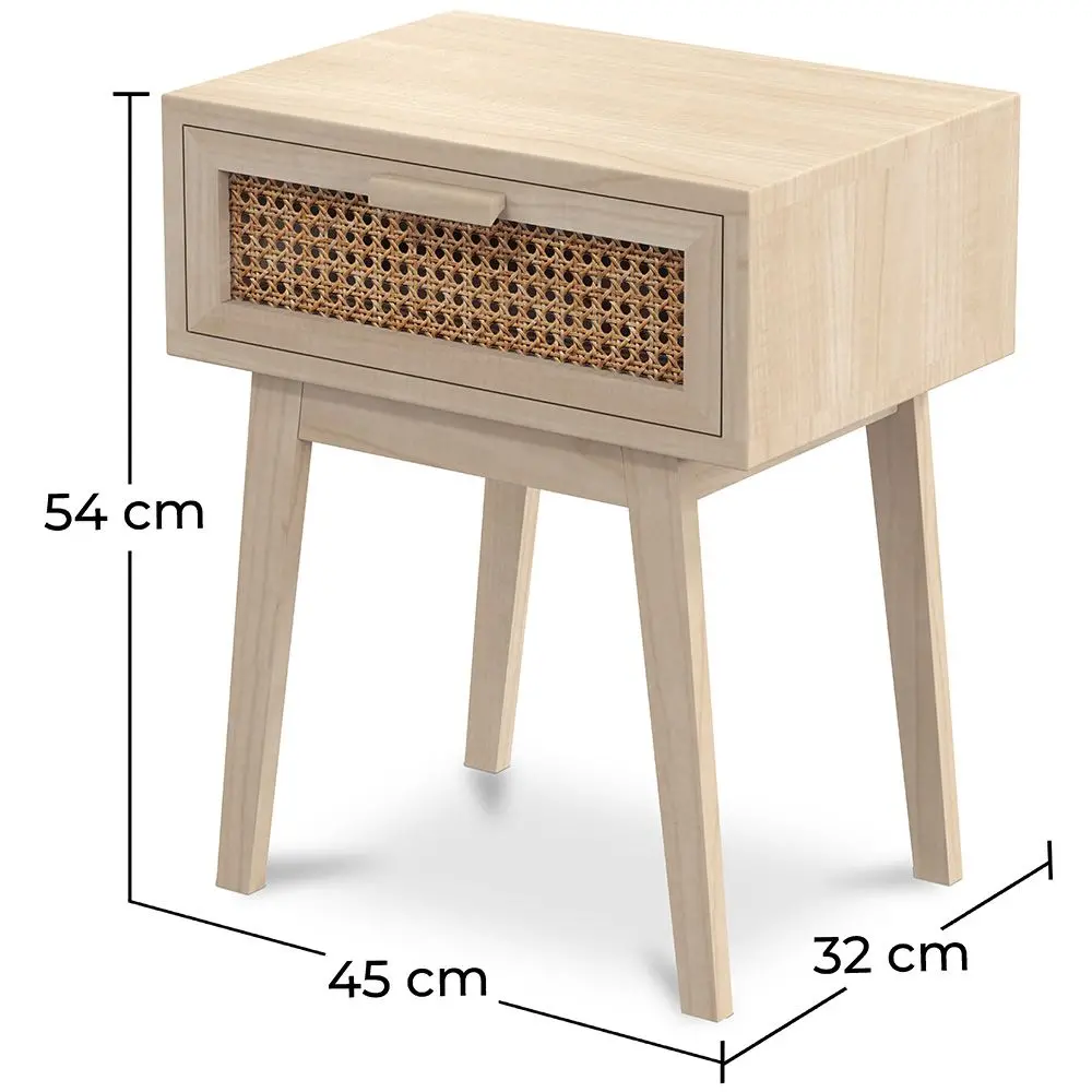Esta mesita de noche de diseño es ideal para dormitorios en la casa o en hoteles. Deja tus objetos personales a mano, como el mando de la tele, el eBook o tu teléfono móvil gracias al espacio de almacenamiento que te ofrece el cajón con frontal de rejilla, el cual se abre y se cierra suavemente gracias a las bisagras de calidad premium. EL ratán con diseño cannage y el color natural de la madera de esta mesita de noche combinan perfectamente con cualquier estilo de decoración. El diseño cannage es típico del estilo boho chic y le dará a tu dormitorio un toque único.