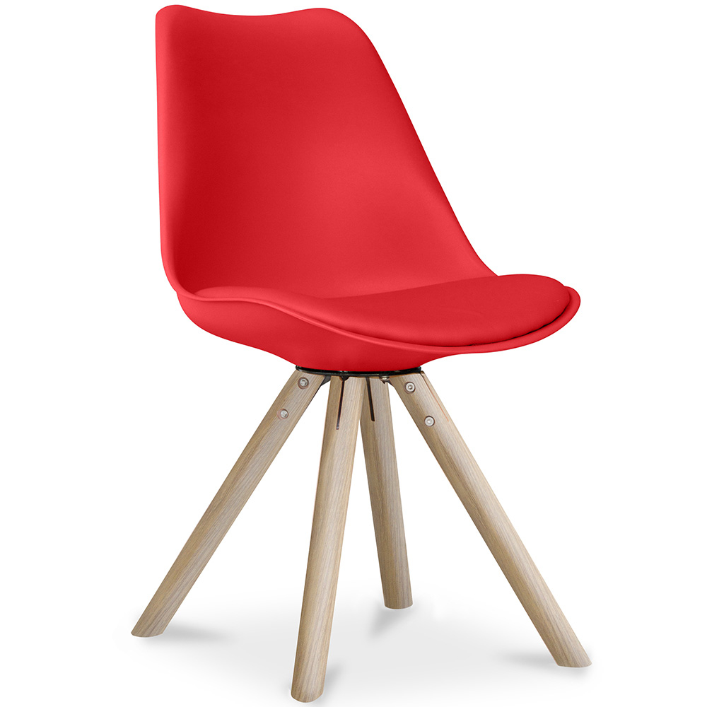 Su asiento está hecho de PP y tiene un cojín tapizado en polipiel para aportarte mayor comodidad. Sus originales patas son de madera de haya maciza, y le aportan estabilidad y resistencia.