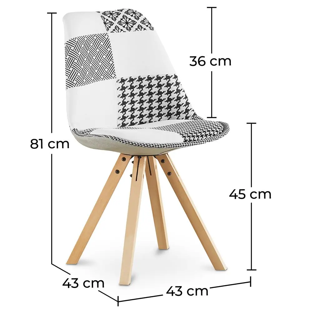 Si estás buscando una silla de comedor tapizada con un diseño diferente y de calidad, esta silla nórdica es una buena elección. Se trata de una silla fabricada con un asiento de polipropileno tapizado en tela patchwork en tonos blanco y negro. Costa de un cojín fijado a la estructura que mejora su comodidad. Las patas de esta silla de diseño son de madera maciza de haya, son robustas y estables, y permiten soportar hastas 120kg de peso.