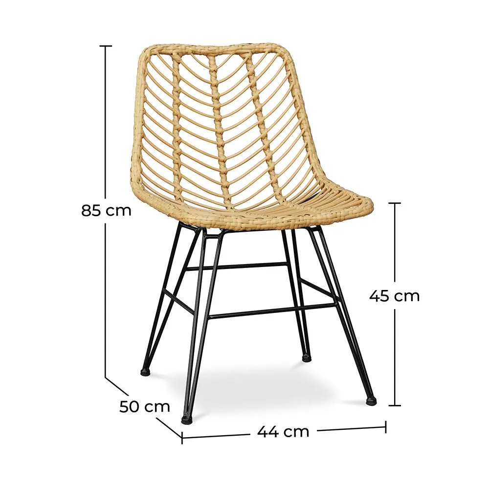 Esta hermosa silla de comedor fabricada en caña sintética tiene un aspecto natural que le dará a tu hogar un toque exótico y desenfadado. Las patas son de metal en color negro y son resistentes y muy estables.