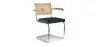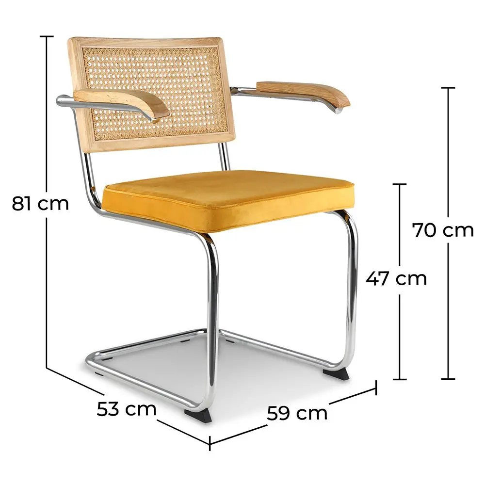 Gracias a su alta resistencia, el ratán es un material idóneo para hoteles, restaurantes o cafeterías con mucha afluencia de clientes. Esta silla de comedor combina a la perfección el ratán natural con el terciopelo clásico. Se trata de una silla con reposabrazos que no pasará desapercibida ya que tiene un aire setentero muy trendy.