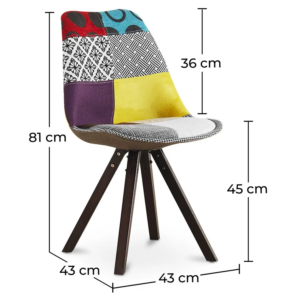 Si lo que busca es aportar un toque de color asu decoracion de interior esta silla de comedor puede ayudarle en dicha tarea. Se trata de una silla de diseño con un asiento de polipropileno tapizado en tela patchwork, consta de un respaldo curvado y un cojín atornillado a la estructura que aportan comodidad sin igual. Las patas fabricadas en madera de haya maciza y pintadas en color marrón oscuro además de aportarle elegancia le confieren a esta silla de estilo escandinava una resistencia y durabilidad capaz de soportar hasta 120 kg de peso.