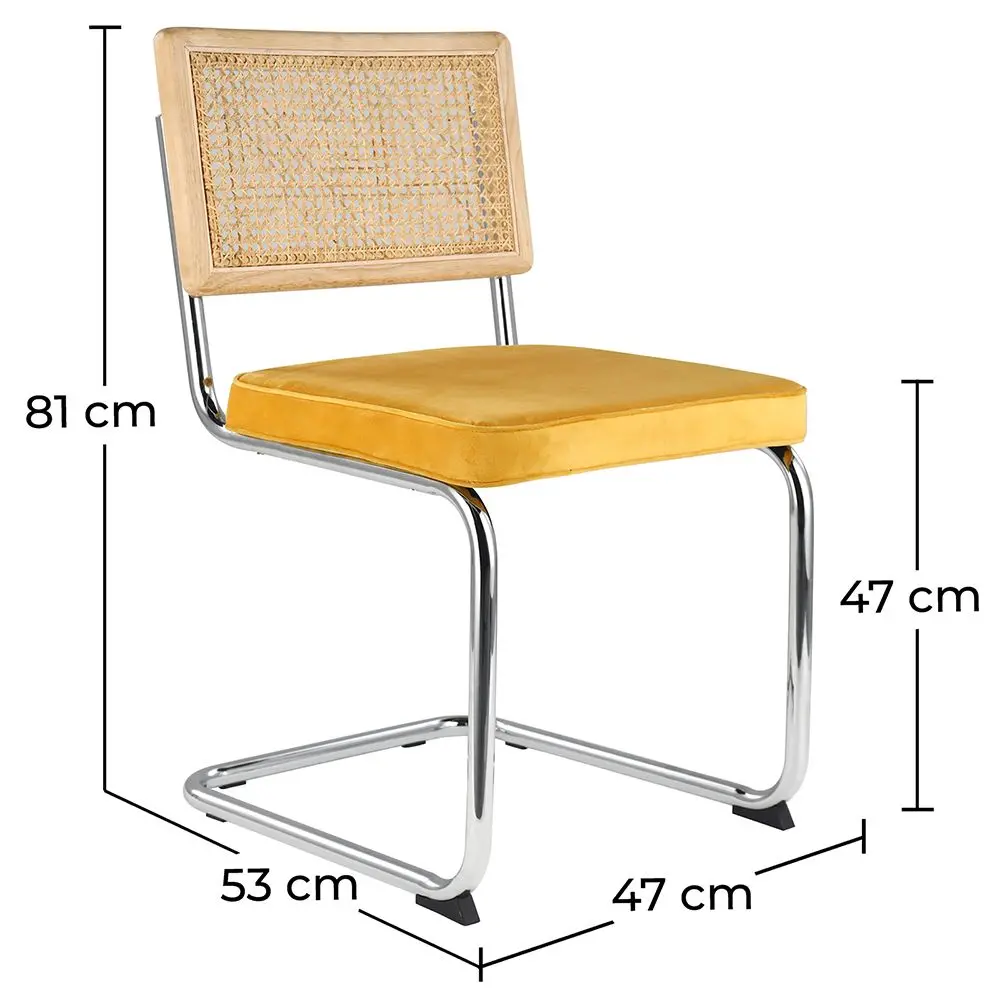 Nuestra silla de comedor Wanda aporta calidez y combina perfectamente con cualquier estilo de decoración. Te encantará la calidad de sus materiales, por un lado el ratán y por otro el suave terciopelo. Versátil, cómoda y de gran calidad, esta silla de diseño inpirado en los años 70 es ideal para un hotel de lujo, un restaurante o una cafetería.