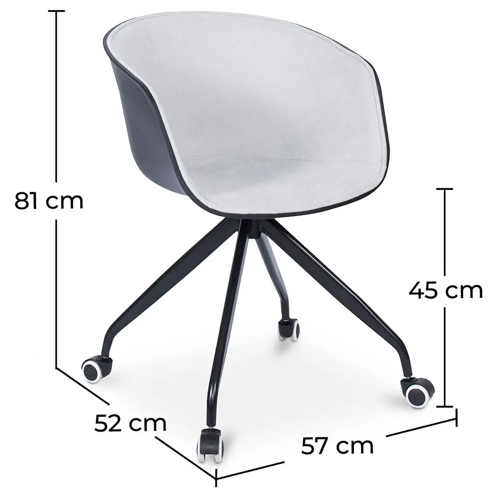 Disfrute de moverse cómodamente en esta silla de oficina con ruedas. El respaldo redondeado de gran tamaño es perfecto para usuarios de oficina de todo tipo. Los diseñadores, ingenieros y empleados tecnológicos a menudo miran varios planos y dispositivos a la vez, por lo que apreciarán la facilidad de movimiento que proporciona esta silla de oficina. El cojín de tela y las patas con recubrimiento en pintura pulverizada facilitan la limpieza. El diseño de la silla destacará en un hogar u oficina comercial. Las medidas de la silla incluyen una profundidad de 52 cm, un ancho de 57,5 cm, una altura de 81 cm y una altura del asiento de 45 cm. Está disponible en diferentes colores.