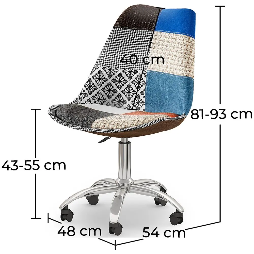 Nuestra silla de oficina giratoria y con ruedas es una silla cómoda y funcional. Ideal para la oficina o el hogar, esta silla tiene un asiento y respaldo ergonómicos tapizados en tela de diseño patchwork, ruedas para un fácil movimiento y una base giratoria. El asiento es ajustable en altura para que cualquier persona, independientemente de su altura, pueda sentarse a trabajar o estudiar cómodamente. Esta silla de escritorio se caracteriza por su diseño moderno y diferente y por la calidad de sus materiales, es must-have para los que buscan una silla decorativa sin renunciar a la funcionalidad.
