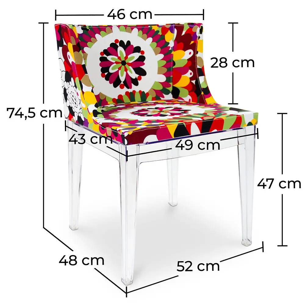 La Silla Madame tiene un estampado floral muy colorido y será la estrella principal de su salón o vestíbulo añadiéndole una nota de color a su decoración. Su marco transparente hace de esta una butaca ligera, pero que sigue manteniendo toda la comodidad. La Silla Madame atraerá la atención de sus visitantes con sus líneas puras y su tapizado primaveral. Queda estupenda como silla de comedor o incluso en un rincón para darwood luminosidad y frescura. Además de ser una silla preciosa otra cualidad innegable de la Madame es su comodidad. No lo pienses más y dale a tu casa el color que le falta.