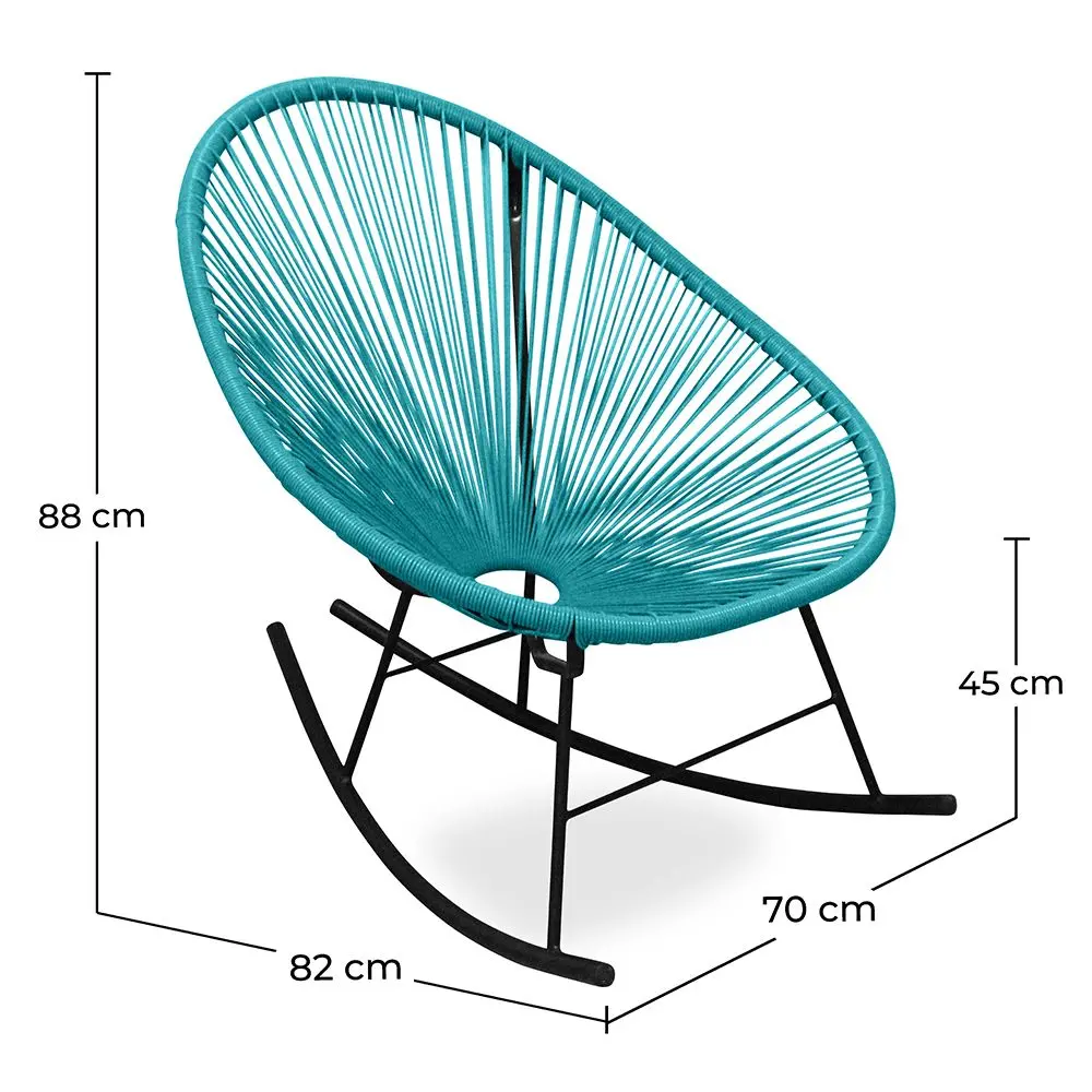 La mítica silla Acapulco se renueva para traerte su versión mecedora. Esta silla que sirve tanto para interior como para exterior está fabricada con una estructura de acero en color negro y un asiento de cuerda sintética.