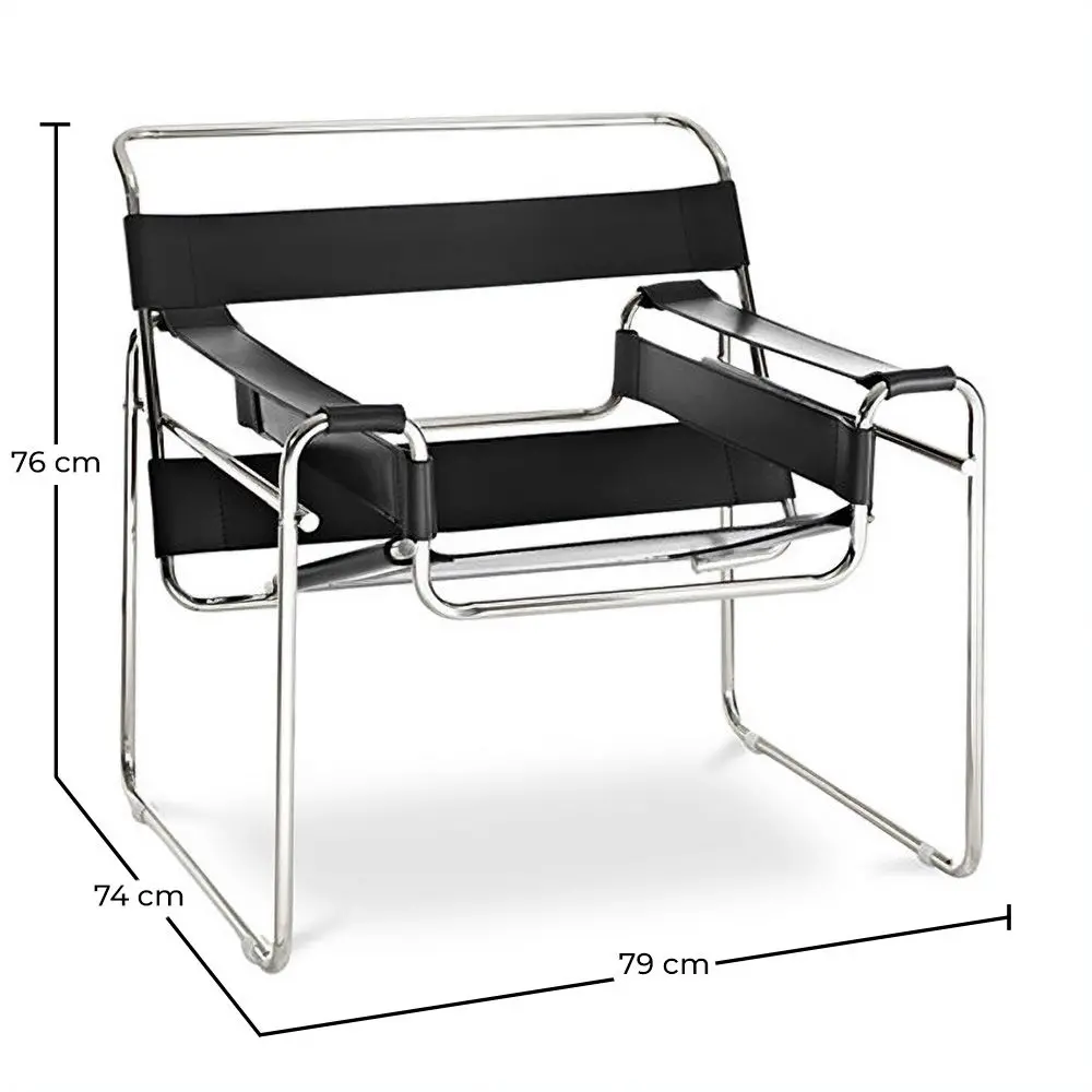 La Silla Wassily es un verdadero encruzijado estructural de tubos de metal que simbolizan lo "mínimo" que una silla debe tener. Esta silla tiene líneas minimalistas que son todo lo que necesita para existir: elegantes líneas para su marco y una cubierta de Cuero Premium como soporte del cuerpo de la persona que se sienta. El asiento tiene un respaldo ligeramente inclinado para asegurar una mayor comodidad. Esta silla de salón provocará la envidia de sus invitados, con su estilo simple y refinado. La Silla Vasyl se puede adaptar a cualquier habitación de su interior, el salón, la cocina, el comedor o la oficina. Mejor aun; esta cómoda silla ocupa muy poco espacio, y proporcionará un aire contemporáneo al resto de su mobiliario.