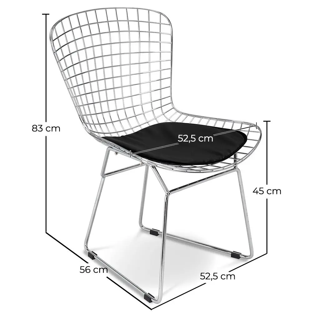 La famosa Silla Wiren compuesta por una red de barras de acero. Es perfecta para ser usada en el comedor o en la cocina. Está hecha en parte de acero inoxidable muy pulido, ofreciendo una flexibilidad mínima y una excelente calidad, y su asiento es de PU.