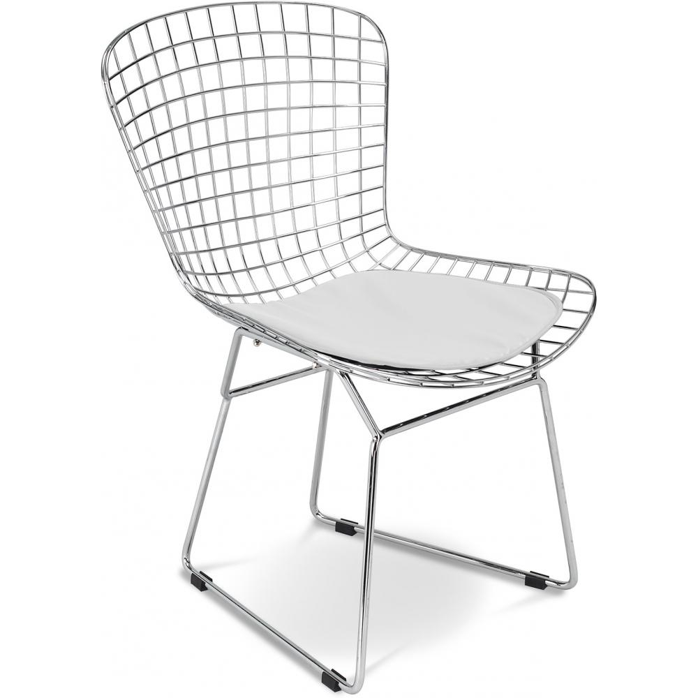 La famosa Silla Wiren compuesta por una red de barras de acero. Es perfecta para ser usada en el comedor o en la cocina. Está hecha en parte de acero inoxidable muy pulido, ofreciendo una flexibilidad mínima y una excelente calidad, y su asiento es de PU.