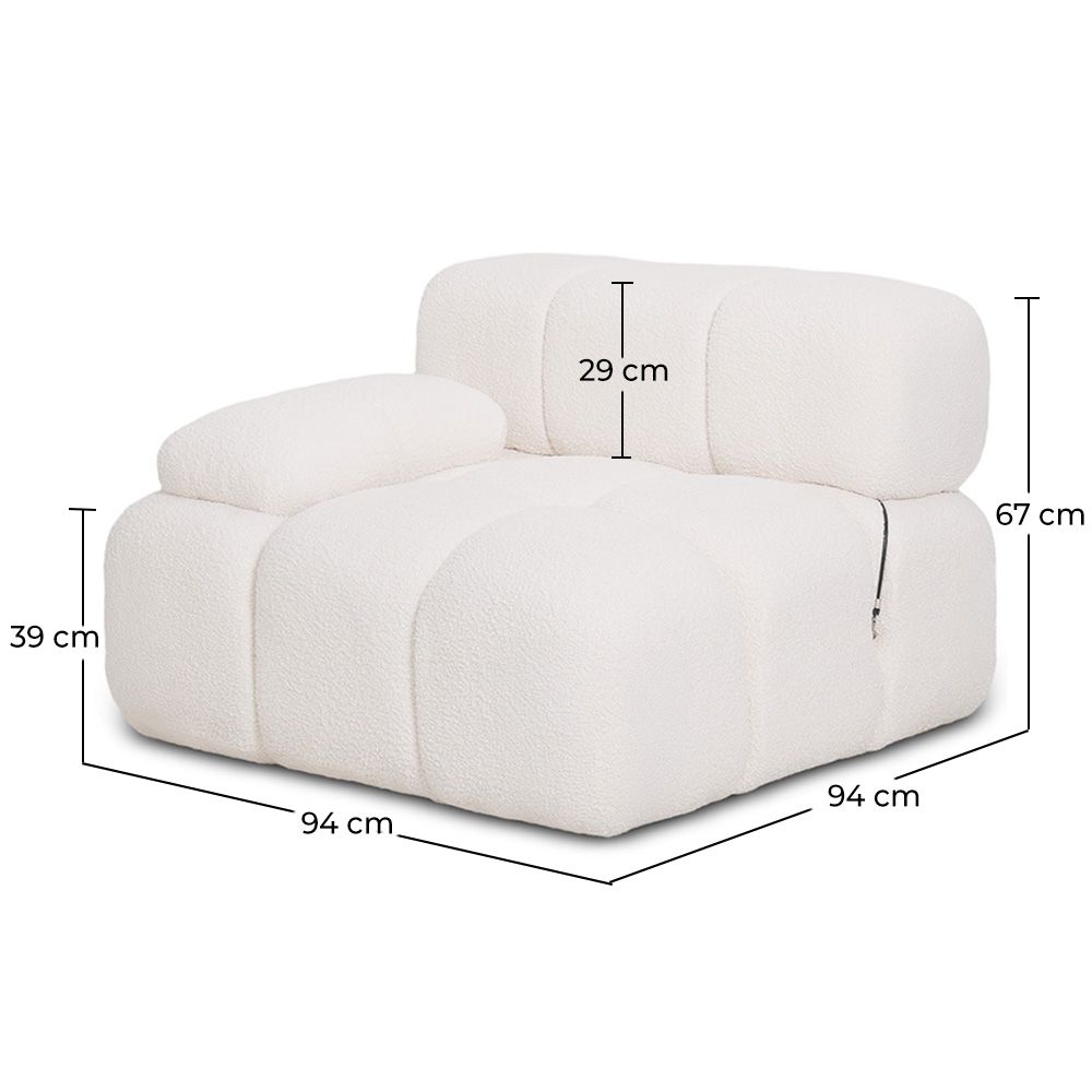 Dale a tu salón un aire contemporáneo y acogedor con este sofá modulable de esquina tapizado en tela bouclé blanco crema. Su diseño versátil permite combinarlo con otros módulos para crear diferentes configuraciones, adaptándose a espacios grandes o pequeños según tus necesidades.