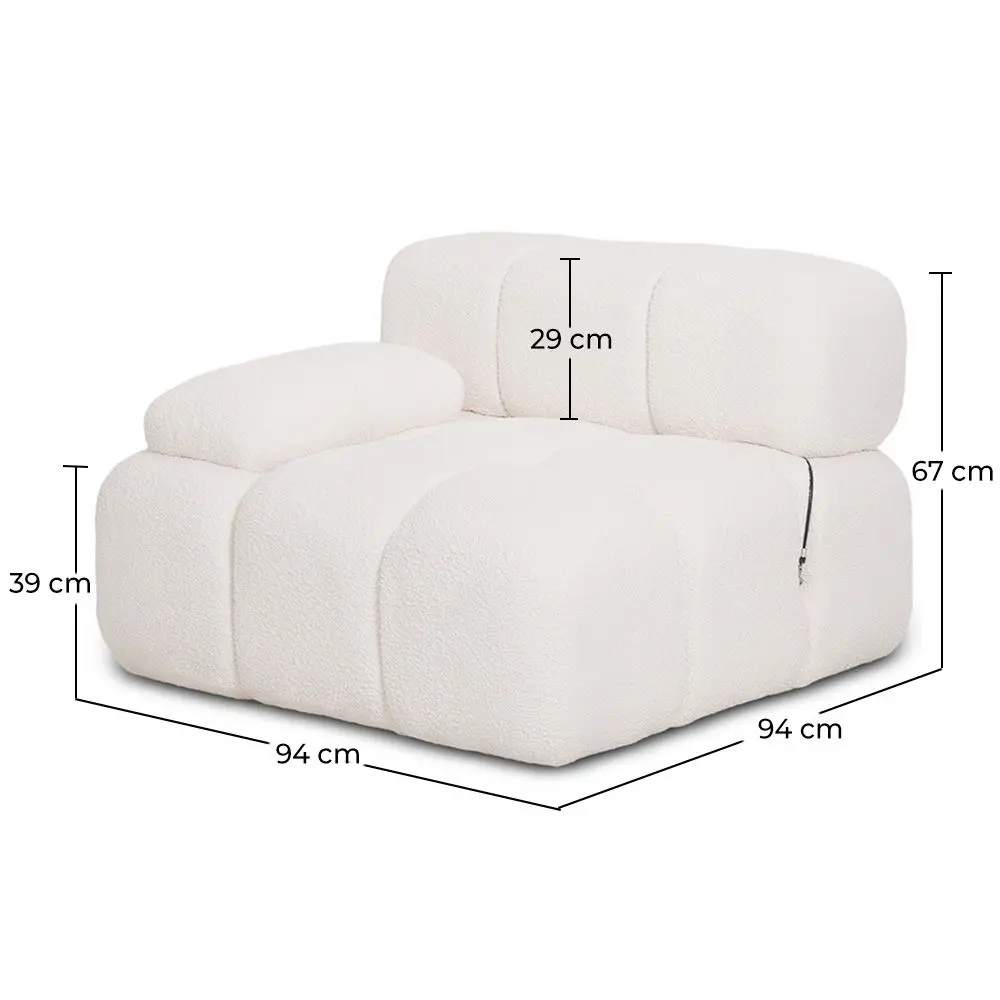 La tapicería en bouclé ofrece un acabado elegante, suave al tacto y resistente al uso diario, aportando calidez y sofisticación a cualquier ambiente. Su acolchado generoso y las líneas redondeadas garantizan una comodidad envolvente, ideal para relajarse, leer o disfrutar en compañía.
