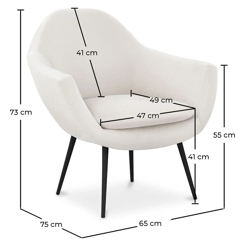 Gracias a la mezcla de bouclé en color blanco y el metal negro, este sillón de diseño es perfecto para cualquier salón, puedes colocarlo junto al sofá y tener un asiento extra, pero también en cualquier rincón de la casa porque no necesita ninguna otra pieza, destaca por sí misma. Su estructura, original y diferente, le aporta una gran personalidad a la decoración de interior del hogar, restaurante o cafetería.