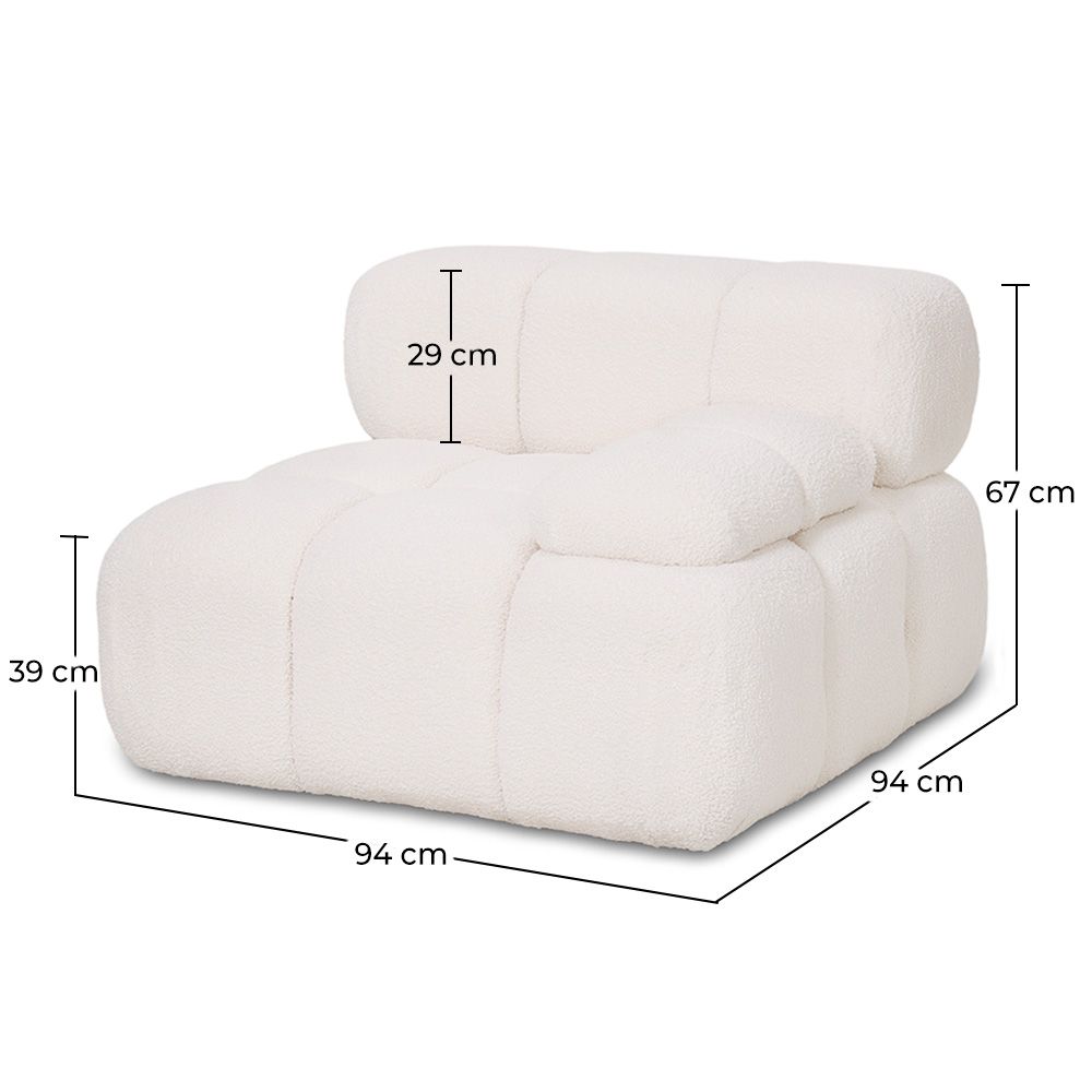 La tapicería en bouclé ofrece un acabado elegante, suave al tacto y resistente al uso diario, aportando calidez y sofisticación a cualquier ambiente. Su acolchado generoso y las líneas redondeadas garantizan una comodidad envolvente, ideal para relajarse, leer o disfrutar en compañía.