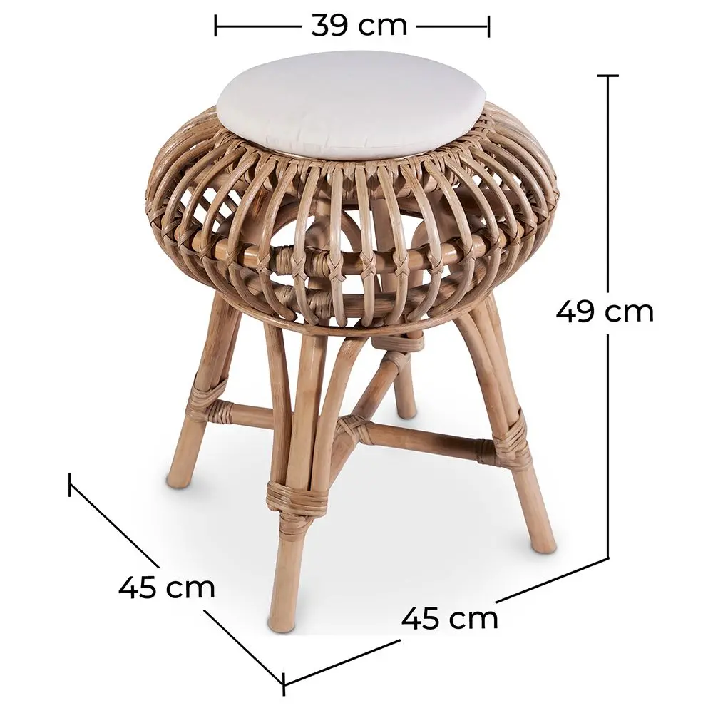 Este taburete de diseño es el complemento ideal para dar un aire informal a una estancia de tu casa sin renunciar a la comodidad. Está fabricado de ratán y tiene un cojín en color claro tapizado en lona. Nuestro taburete bajo de estilo boho aportará a cualquier espacio un toque de frescura muy especial. Este taburete de ratán es perfecto también para hoteles, cafeterías y restaurantes.