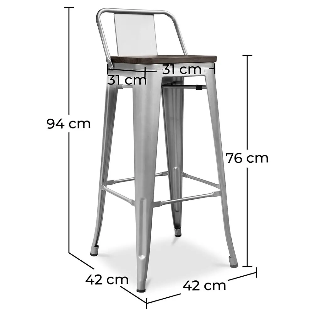 Disfruta de la perfecta combinación entre confort y estilo con el taburete Metalix que cuenta con respaldo y asiento en madera oscura natural. Con una altura de 76 cm desde el suelo al asiento, es ideal para barras altas, islas de cocina o espacios de hostelería que buscan una estética industrial auténtica y sofisticada.
