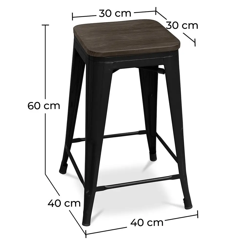 Con una altura de 60 cm del suelo al asiento, es perfecto para barras de cocina o encimeras de aproximadamente 90 cm. Su asiento de madera oscura añade un toque cálido y sofisticado, mientras que la estructura metálica garantiza estabilidad y resistencia para un uso diario intensivo.
